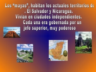 Los mayas habitaron territorios que hoy corresponden a El Salvador y Nicaragua hace alrededor de 1300 años, organizándose en ciudades independientes gobernadas por un halac unic. Destacaron por su arquitectura, creando grandes centros ceremoniales y administrativos, y desarrollaron técnicas agrícolas como la milpa para cultivar maíz, tomate y lechuga. El jade tuvo un significado especial para ellos, representando la vida eterna y utilizándose en objetos ceremoniales y utilitarios, como la famosa máscara de jade de Pacal.