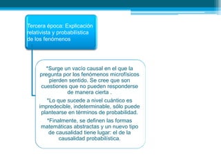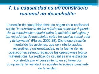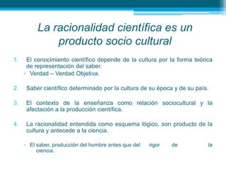 Este documento discute la relación entre la ciencia y la cultura. Sostiene que la racionalidad científica es un producto sociocultural y que el conocimiento científico depende de la cultura en la que se produce. También explica que la noción de causalidad tiene su origen en la acción del sujeto y es un constructo racional utilizado por el pensamiento para comprender la realidad, aunque la explicación causal no siempre es posible, especialmente a nivel cuántico donde los fenómenos son impredecibles. Finalmente, argumenta que la educ