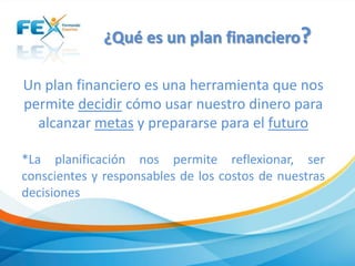 Un plan financiero es una herramienta que permite planificar el uso del dinero para alcanzar metas a corto, mediano y largo plazo. Incluye establecer metas específicas con tiempos y costos definidos, y elaborar un presupuesto con los ingresos y gastos estimados. Un presupuesto muestra las diferentes fuentes de ingresos, tipos de gastos y ahorros, y es útil para asegurar que los ingresos cubran los gastos y se pueda ahorrar para metas futuras. Se recomienda monitorear los gast