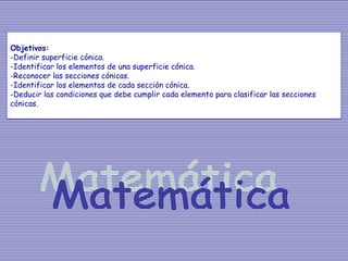 El documento define las secciones cónicas y describe sus elementos característicos. Explica que las secciones cónicas son las curvas de intersección de un cono con un plano, y que en función del ángulo entre el eje del cono y el plano se obtienen elipses, parábolas, hipérbolas o circunferencias. Luego detalla los elementos clave de cada curva cónica, incluyendo sus focos, vértices, ejes y asíntotas.