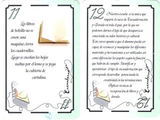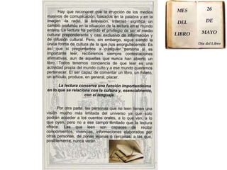 El documento detalla un programa de actividades de la Escuela de Artes y Artesanías Dr. Pedro Figari en celebración del Día Nacional del Libro, que se llevará a cabo del 2 al 31 de mayo de 2011. Incluye exposiciones sobre libros de arte del siglo XIX y conferencias relacionadas con la lectura y bibliotecas, además de un concierto y maratón de lectura. Las actividades están abiertas al público en distintas ubicaciones y horarios, promoviendo el aprecio por la literatura y la cultura.