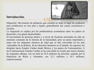 Este documento discute la migración de niños y sus derechos. Explica que los niños migrantes son muy vulnerables a abusos y explotación cuando cruzan fronteras. También describe las tres situaciones por las cuales los niños migran: junto a sus padres, quedándose en su país mientras sus padres se mudan, o migrando solos. Finalmente, argumenta que se necesitan políticas públicas para proteger los derechos de los migrantes menores de edad.