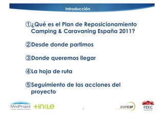 El documento presenta el Plan de Reposicionamiento Camping & Caravaning España 2011. El plan tiene como objetivo mejorar la percepción pública del camping y el caravaning en España mediante acciones coordinadas. Se analiza la situación actual comparada con otros países europeos, y se establecen objetivos como cerrar la brecha con los líderes europeos y atraer nuevos segmentos. El plan propone una hoja de ruta con tres fases y seguimiento a través de informes y comités.