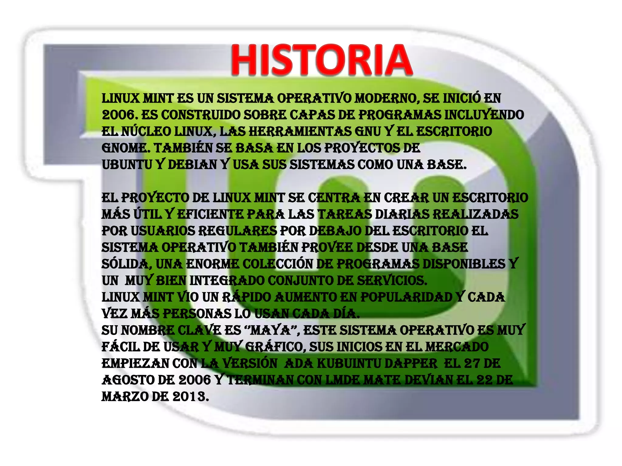 Linux Mint es un sistema operativo moderno creado en 2006 sobre las capas de programas de Linux, GNU y Gnome. Se basa en los proyectos de Ubuntu y Debian y se enfoca en crear un escritorio más útil y eficiente para usuarios regulares. Linux Mint ha ganado popularidad rápidamente y cada vez más personas lo usan diariamente debido a su facilidad de uso y gráficos atractivos.