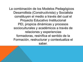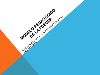 El documento describe el modelo pedagógico de la FCECEP, el cual combina enfoques constructivistas y socialistas. Este modelo busca promover aprendizajes significativos a través de experiencias que vinculen los nuevos conocimientos con lo que ya saben los estudiantes. El modelo también enfatiza la educabilidad y la investigación, asignando roles de investigador al docente y coinvestigador al estudiante.
