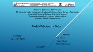 Este documento presenta una introducción al modelo relacional de bases de datos. Explica conceptos clave como tablas, registros, campos, tuplas, dominios, claves primarias e índices. También cubre temas como el álgebra relacional, restricciones, normalización, dependencias funcionales y descomposición de relaciones en forma normal boyce codd. El objetivo es proporcionar una visión general de la estructura y funcionalidad del modelo relacional.