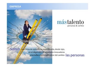 Esta firma de consultoría se especializa en el desarrollo del capital humano de las organizaciones mediante soluciones innovadoras orientadas al cambio de las personas. Su misión es ejecutar estrategias que mejoren las capacidades profesionales de los empleados a través de un proceso que incluye una evaluación inicial, un plan de intervención personalizado y un seguimiento continuo. Ofrecen diferentes programas de formación, coaching y proyectos de equipo para mejorar las habilidades, liderazgo, rendimiento y compromiso del personal.