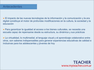 El documento describe un software web llamado My Teacher creado para facilitar la gestión de contenidos educativos. My Teacher permite a docentes, directivos y personal compartir documentos, calificaciones y comunicarse para mejorar las experiencias educativas a través de la tecnología disponible en las escuelas.