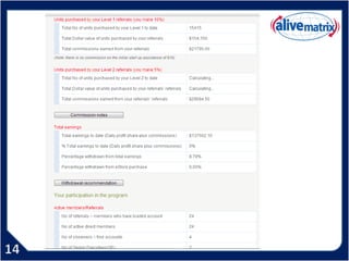 Este documento promueve un programa de marketing multinivel que ofrece a los participantes la oportunidad de ganar dinero a través de la compra y venta de unidades publicitarias en línea, la generación de ingresos por publicidad, y la construcción de equipos de trabajo. El programa ofrece varias formas de ganar dinero, como ingresos diarios, semanales o mensuales residuales, así como el potencial de ganancias más altas. Sin embargo, también advierte que los resultados pueden variar dependiendo de los esfuerzos de marketing individuales.