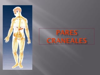 El documento describe los diferentes nervios craneales, incluyendo su origen, funciones e inervación. Se mencionan los nervios olfatorio, óptico, motor ocular común, motor ocular externo, trigémino, abducens, facial, vestibulococlear, glosofaríngeo, vago, espinal y hipogloso.