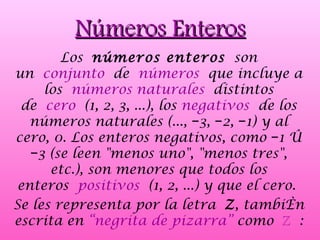 Los números enteros incluyen los números naturales distintos de cero, los números negativos de los naturales y el cero. Se representan por la letra Z y están ordenados en la recta numérica, donde los números negativos son más pequeños cuanto más a la izquierda y tienen un valor absoluto que es el número natural que resulta de quitarles el signo.
