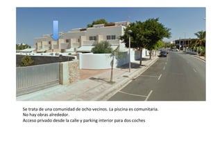 Este documento proporciona información sobre una comunidad de ocho vecinos con piscina comunitaria y acceso privado desde la calle con parking para dos coches. Se encuentra a 200 metros de la playa de Port d'Es Torrent y proporciona detalles sobre otras playas y lugares cercanos como Cala Bassa, Cala Comte, Cala Tarida y el pueblo de Sant Josep de Sa Talaia, así como la ubicación de un hipermercado a 1,5 km.