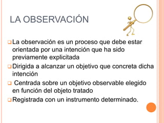 Este documento describe los métodos de observación sistemática aplicados a la educación infantil. Explica que la observación debe estar orientada por una intención previamente definida y centrada en un objetivo observable. También describe las condiciones para una buena observación como definir el objeto de evaluación, elegir el método e instrumento adecuado y registrar las conductas de forma precisa. Finalmente, explica los tipos de observación, sus finalidades e instrumentos como diarios, registros anecdóticos y listas de control utilizados en educación infantil.