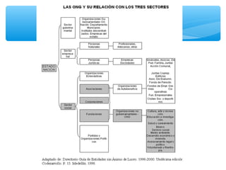Este documento describe las organizaciones no gubernamentales (ONG). Define las ONG como grupos independientes de los gobiernos que se enfocan en fines humanitarios y no lucrativos. Explica que las ONG pueden tener diferentes formas jurídicas como asociaciones o fundaciones y que se financian a través de donaciones para mejorar aspectos de la comunidad sin buscar ganancias. También menciona algunas de las ONG más grandes como la Cruz Roja y Greenpeace.