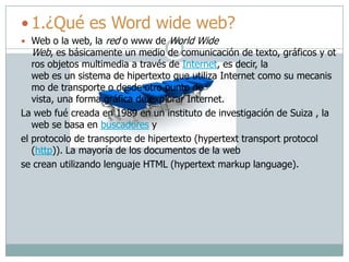 La World Wide Web (WWW) o simplemente la web es un sistema de publicación de documentos hipermedia interconectados y accesibles públicamente a través de Internet. Fue creada en 1989 y se basa en protocolos como HTTP y lenguajes como HTML para crear páginas web que pueden contener texto, imágenes, videos y otros contenidos.
