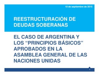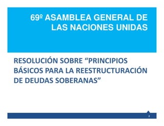 El documento aborda los 'principios básicos' para la reestructuración de deudas soberanas, enfatizando el derecho de un estado soberano a gestionar su deuda y la importancia de negociaciones constructivas entre deudores y acreedores. Se destacan principios como la transparencia, imparcialidad, trato equitativo y sostenibilidad, que deben guiar el proceso de reestructuración. La propuesta, respaldada por el G77+China, busca establecer un marco justo y ordenado para las reestructuraciones de deuda, promoviendo la participación de todos los acreedores.
