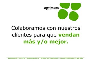 Optimum es una consultora que colabora con clientes para ayudarlos a vender más y mejor mediante la auditoría de procesos de ventas, la implementación de mejoras, y la formación. Ofrece servicios de auditoría de procesos comerciales, canales de distribución e investigación de mercado, además de implementar acciones de mejora y formación para vendedores, postventa, atención al cliente y canales de distribución. Su objetivo es reforzar la táctica comercial de los clientes para ejecutar su estrategia.