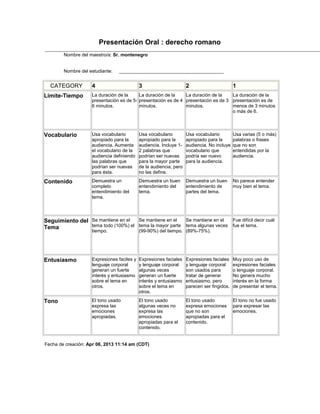 Este documento presenta una rúbrica para evaluar presentaciones orales sobre derecho romano. La rúbrica evalúa seis categorías: límite de tiempo, vocabulario, contenido, seguimiento del tema, entusiasmo y tono. Cada categoría tiene cuatro niveles de desempeño con descripciones para cada nivel.