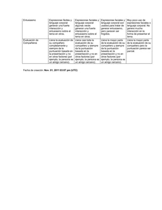 Este documento presenta una rúbrica para evaluar presentaciones orales, con categorías como escuchar a otros, atuendo, contenido, claridad al hablar, seguimiento del tema, uso de apoyos, entusiasmo y evaluación de compañeros. La rúbrica describe los niveles 4, 3, 2 y 1 para cada categoría, con el nivel 4 siendo el más alto y el nivel 1 el más bajo.