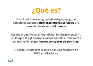 El Global Service Jam se celebrará en Villaviciosa, Asturias, del 1 al 3 de marzo de 2013, donde equipos de personas se reunirán para diseñar y crear nuevos conceptos de servicios en un fin de semana. El evento busca convertir ideas en prototipos a través de trabajo en equipo y decisión conjunta, enfatizando la importancia de la acción sobre la mera conversación. Los participantes podrán disfrutar de un ambiente colaborativo y de innovación, con sesiones programadas para inspirar, crear y presentar servicios innovadores.