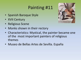 El documento presenta 20 obras de arte de los siglos XVII y XVIII, principalmente de estilo barroco, de diferentes escuelas como la española, italiana, holandesa y francesa. Las obras incluyen pinturas, esculturas y representan diversos temas como escenas religiosas, mitológicas, retratos y de género. Todas las obras destacan por su realismo, claroscuro y composiciones dinámicas típicas del estilo barroco.