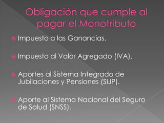 El monotributo es un régimen simplificado para pequeños contribuyentes que concentra en un único tributo el componente impositivo y previsional. Los monotributistas deben inscribirse en la AFIP y en la Dirección General de Rentas de su provincia. Pueden ser monotributistas personas físicas, sucesiones indivisas, cooperativas de trabajo y algunas sociedades de hecho e irregulares, siempre que cumplan con los límites de facturación, superficie, energía eléctrica y alquiler establecidos.