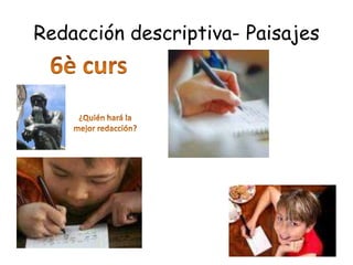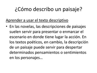 Este documento ofrece instrucciones para escribir una descripción descriptiva de un paisaje. Explica que una descripción debe proporcionar detalles desde lo general a lo particular, utilizando palabras que indican la ubicación espacial de los objetos. Además, da un ejemplo de descripción de una cueva escrita por Pío Baroja que sigue estas pautas, describiendo primero la visión general y luego los detalles más específicos ubicados en el espacio de la cueva. El documento concluye indicando una actividad para que