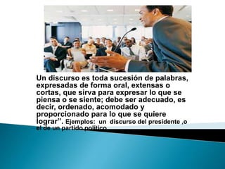 El documento habla sobre los diferentes tipos de discursos, sus características y elementos. Explica que un discurso puede ser para entretener, informar o persuadir, y debe estar dirigido a un público específico. También describe los tipos de discursos (leído, memorizado e improvisado), así como elementos como la introducción, desarrollo y conclusión.