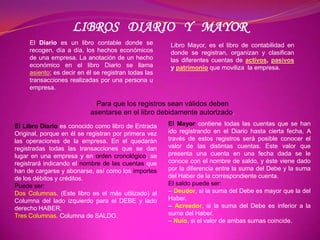 Este documento describe los libros Diario y Mayor y cómo se usan en contabilidad. El Diario registra todas las transacciones de una empresa de manera cronológica asignando cuentas débito y crédito. El Mayor contiene las cuentas del Diario y sus saldos, mostrando el valor de cada cuenta a través del tiempo. Un asiento de Diario incluye fecha, cuentas débito y crédito, e importes para describir una transacción.