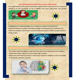 El documento explora los paradigmas educativos, entendidos como modelos mentales que estructuran nuestras percepciones y enfoques de aprendizaje y enseñanza. Se destacan varios paradigmas, como el conductista, constructivista, cognitivo, humanista, entre otros, cada uno con sus características y teorías subyacentes sobre el proceso educativo. Además, se profundiza en la evolución de estos paradigmas y su relación con distintas corrientes filosóficas y científicas.