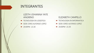 El documento lista los nombres y detalles de dos estudiantes, Lizeth Johanna Yate y Elizabeth Campillo, incluyendo sus programas de estudio, sede y horario. También enumera los tipos de carpetas de correo electrónico que existen y diferentes formas de enviar un correo electrónico, incluyendo cuentas en Outlook, Gmail, SlideShare y Yahoo.