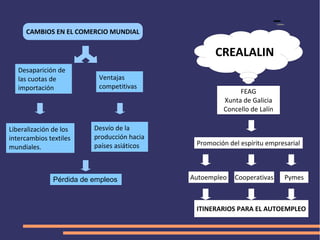 Este documento describe un itinerario para fomentar el autoempleo entre personas desempleadas del sector textil. El itinerario incluye entrevistas, apoyo para desarrollar ideas de proyecto, apoyo para poner en marcha las empresas, y recursos para la creación de empresas como cooperativas y pymes. El objetivo final es recolocar a 15 personas desempleadas del textil a través de la creación de una cooperativa textil.