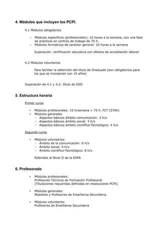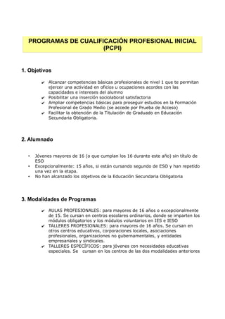 Este documento describe los Programas de Cualificación Profesional Inicial (PCPI), que tienen los objetivos de alcanzar competencias básicas profesionales de nivel 1, posibilitar una inserción sociolaboral satisfactoria, y ampliar competencias para proseguir estudios de Formación Profesional de Grado Medio. Los PCPI están dirigidos a jóvenes mayores de 16 años sin título de ESO. Incluyen módulos obligatorios y voluntarios en áreas profesionales, formativas y comunicativas impartidos en centros escolares
