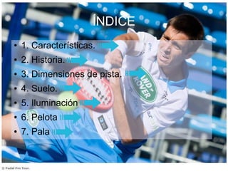 El pádel es un deporte de raqueta que se juega en parejas en una cancha rectangular cerrada. Se originó en México en la década de 1960 y ha crecido en popularidad en países de América Latina y Europa. La cancha mide 10m de ancho por 20m de largo con paredes alrededor. El juego consiste en usar palas para devolver una pelota de goma a través de una red divisoria.