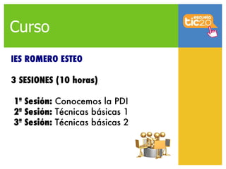 El documento presenta un curso de tres sesiones sobre el uso de una pizarra digital interactiva. Explica los componentes básicos de una pizarra digital, como el proyector y el equipo, y diferentes modelos. Da consejos de seguridad y explica cómo encender y apagar la pizarra y los dispositivos de entrada. Describe algunas funciones básicas como escribir, reproducir contenidos multimedia, y software instalado. Las prácticas se centran en la puesta en marcha de la pizarra digital, el uso de unidades USB, y la inserción