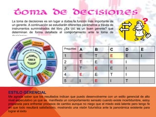Este documento resume los resultados de varias evaluaciones sobre el estilo gerencial y habilidades de toma de decisiones de una persona. Los resultados indican que la persona tiene un estilo gerencial especulativo y futurista, con la habilidad de enfrentar cambios aunque con cierto miedo. También muestra un control equilibrado entre pensamiento y emociones, y la habilidad de considerar las consecuencias de las decisiones aunque a veces se demora en tomarlas.