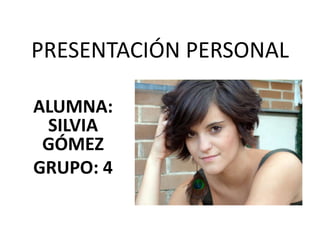 Silvia Gómez presenta información personal sobre sí misma, incluyendo su edad de 18 años, su familia compuesta por sus padres y dos hermanos, y sus 14 años de experiencia en danza. Ella disfruta de la danza clásica, contemporánea, moderna y hip-hop, y participó en un Flashmob solidario en 2010. Su objetivo es estudiar Trabajo Social para ayudar a las personas y también perseguir una carrera profesional en danza.