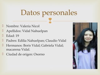 Este documento presenta información personal sobre Valeria Nicol Vidal Nahuelpan, una mujer de 19 años originaria de Osorno, Chile. Incluye detalles sobre su familia, gustos e intereses como la natación, la música romántica y electrónica, y la película Resident Evil. También describe cómo pasa su tiempo libre haciendo voluntariado, crucigramas y escuchando música con su familia y amigos.