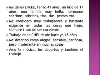 Este documento presenta una breve introducción de Ericka, una mujer de 41 años que trabaja en CNFL. Ella se describe a sí misma como trabajadora, exigente, alegre, sensible y cariñosa. Le gusta la música romántica, los deportes y su trabajo. También menciona que tiene 18 años trabajando en el área administrativa de CNFL y un hijo de 17 años que ingresará a la universidad para estudiar ingeniería.