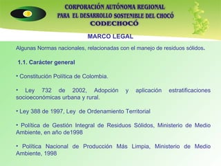 El documento presenta el marco legal colombiano relacionado con la gestión integral de residuos sólidos y los planes de gestión integral de residuos sólidos (PGIRS). Describe los objetivos generales de los PGIRS, su contenido que incluye diagnósticos socioeconómicos, ambientales y técnicos, y estrategias para la capacitación, responsabilidad institucional y participación ciudadana. El enfoque global de los PGIRS es generar capacidad para soluciones sostenibles que consideren los impactos ambiental, social, económico, político
