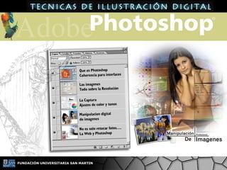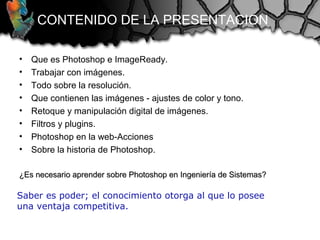 Este documento presenta una introducción a Photoshop e ImageReady. Explica los conceptos básicos de trabajar con imágenes de mapa de bits y gráficos vectoriales, la resolución de imágenes y cómo afecta el tamaño de archivo. También cubre temas como ajustes de color y tono, filtros, plugins, optimización de imágenes para la web y una breve historia de Photoshop.