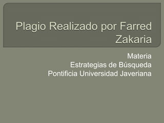 El documento describe un caso de plagio cometido por el periodista Fareed Zakaria. Zakaria copió párrafos textuales de un ensayo de Jill Lepore, profesora de Harvard, en una de sus columnas como editor de la revista Time. Esto le generó la suspensión como editor de Time y de su programa en CNN, aunque aceptó responsabilidad y ofreció disculpas públicas. El caso resalta la importancia de evitar el robo de material y presentar las ideas de otros como propias.