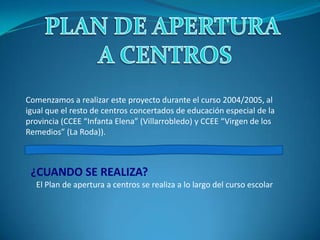 El documento describe un plan de apertura a centros ordinarios realizado por un colegio de educación especial. El plan tiene como objetivo integrar a los alumnos con necesidades especiales en actividades normalizadas para fomentar su socialización e incrementar la tolerancia de la sociedad. El plan consiste en la participación de los alumnos en actividades de otros centros y en abrir sus puertas para que alumnos ordinarios participen. Se detallan las visitas y actividades realizadas entre los centros.