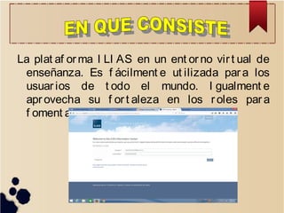 ILIAS es una plataforma virtual de enseñanza y aprendizaje que permite la cooperación y el trabajo colaborativo entre usuarios de todo el mundo. Ofrece herramientas educativas como grupos, comunicación, administración de cursos, evaluaciones y correo electrónico para mejorar la calidad de la enseñanza y atender las necesidades de los estudiantes. Aunque requiere capacitación en entornos electrónicos, facilita el uso de recursos multimedia y el apoyo a la enseñanza presencial.