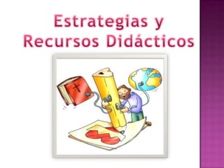 Este documento define los recursos didácticos como cualquier material que facilita tanto la labor del docente como del alumno en un contexto educativo. Describe dos tipos de recursos didácticos: materiales convencionales como libros, pizarras y juegos; y materiales audiovisuales como diapositivas, casetes y videos. El objetivo de los recursos didácticos es relacionar los contenidos con habilidades y conocimientos de los estudiantes.
