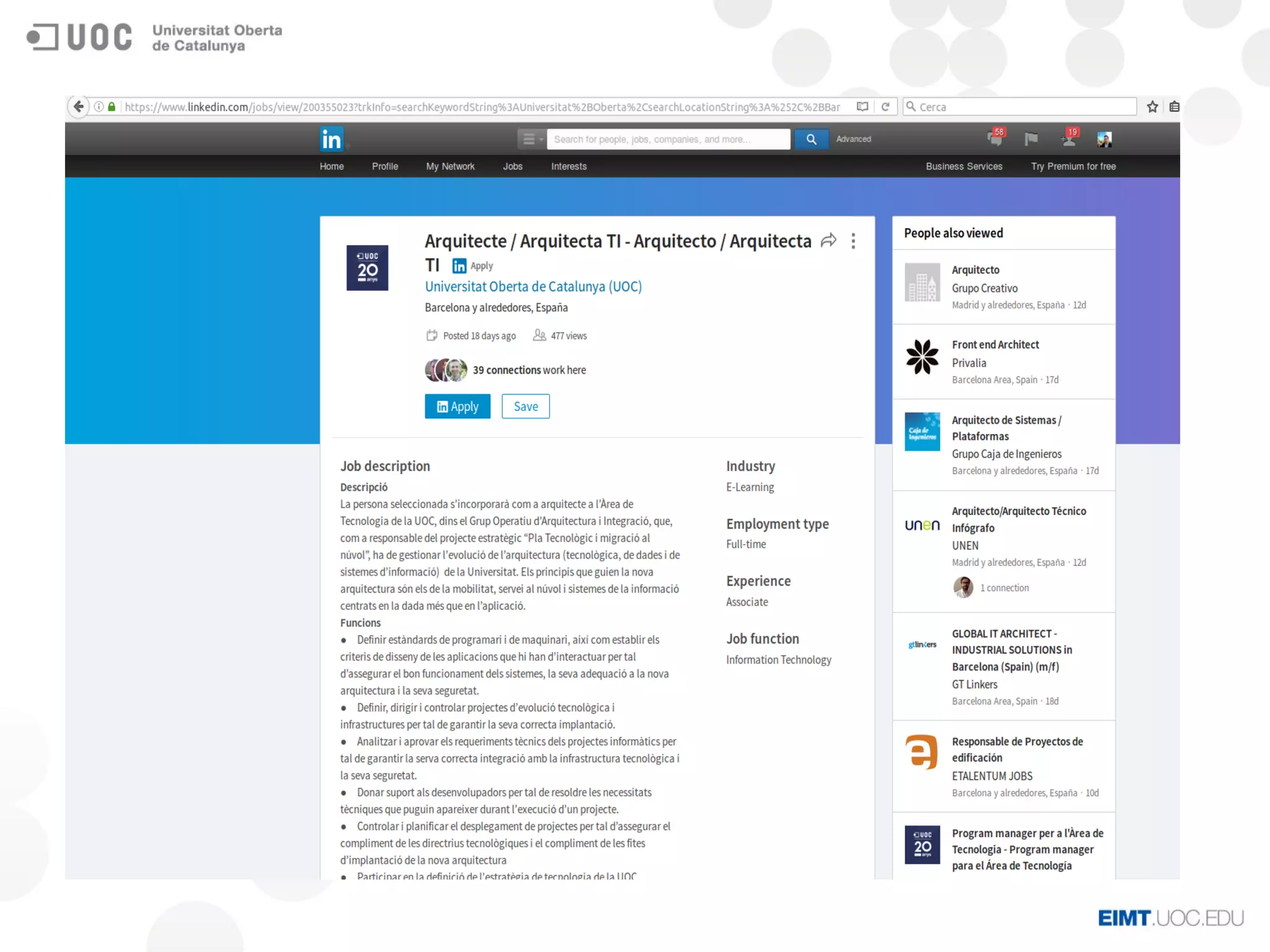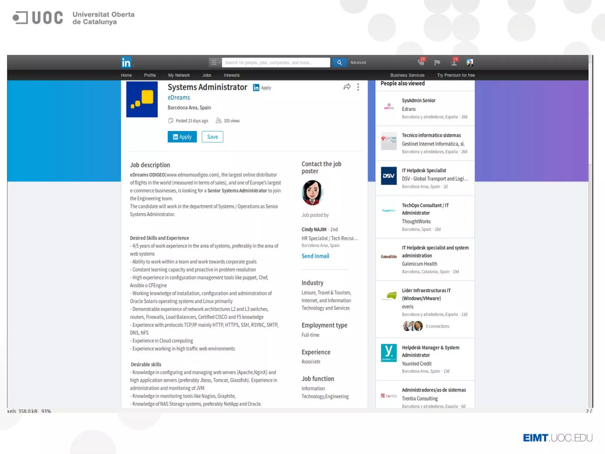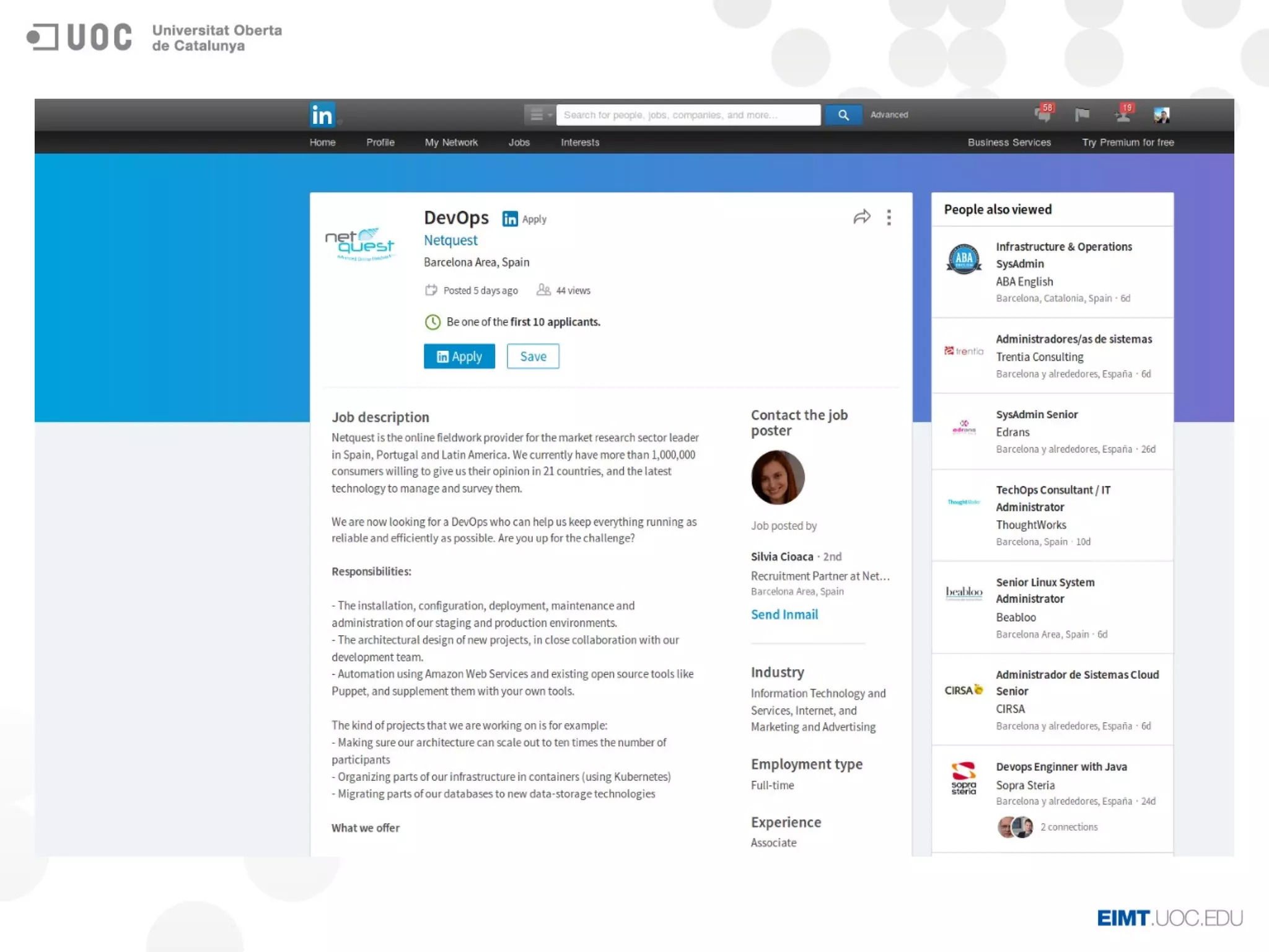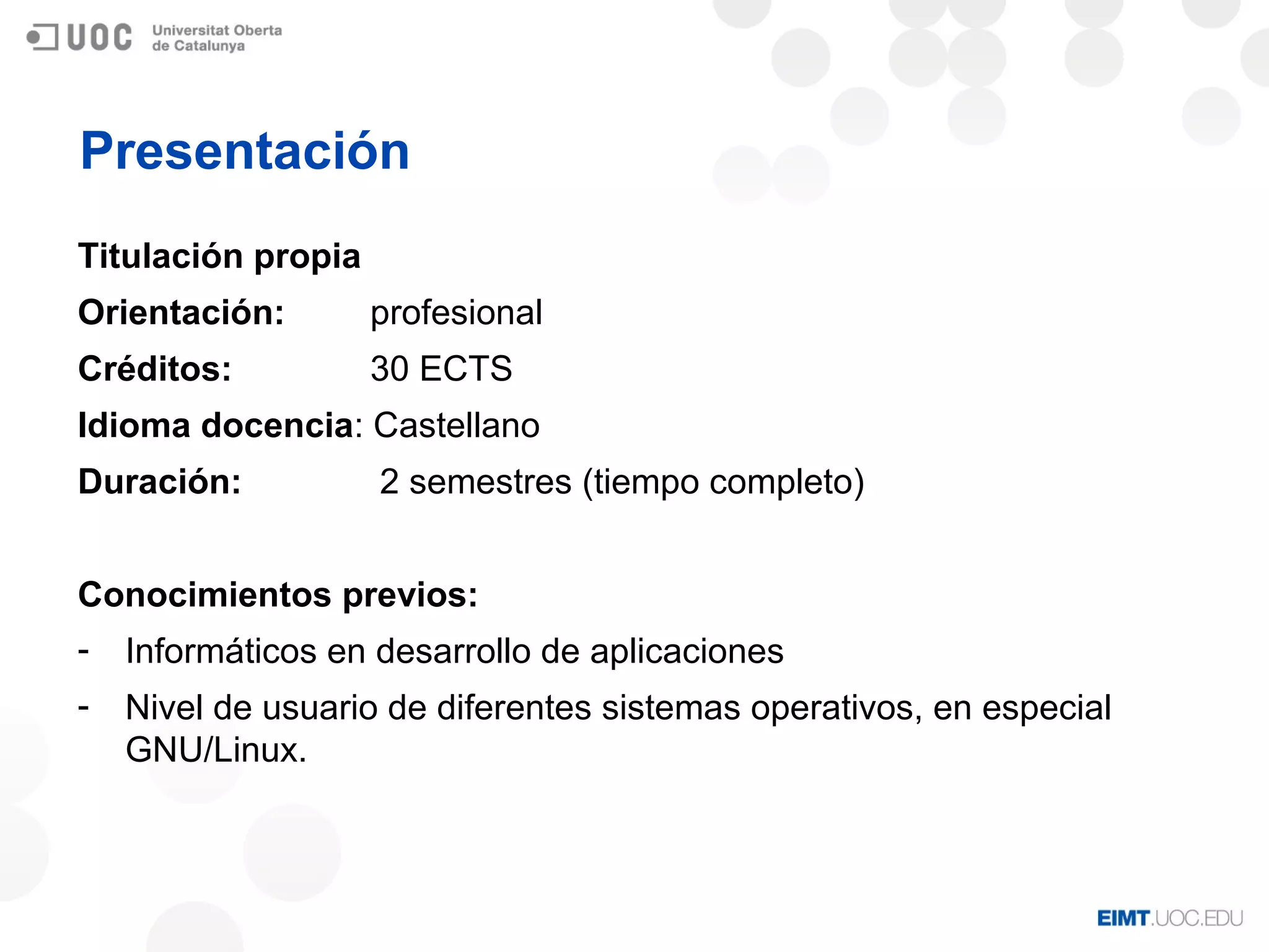 Este posgrado de 30 créditos ECTS se ofrece en dos semestres y está dirigido a perfiles de administración de sistemas y devOps. El plan de estudios incluye asignaturas sobre administración de sistemas GNU/Linux, administración avanzada, diseño y administración de arquitecturas cloud, devOps y seguridad en cloud, y un trabajo final. El objetivo es formar a los estudiantes para que puedan administrar sistemas y servicios cloud de forma óptima.