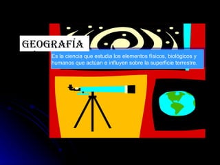 Este documento describe la geografía y sus ramas principales, incluida la hidrografía. Explica que la geografía estudia los elementos físicos, biológicos y humanos de la Tierra. Luego describe brevemente las ciencias auxiliares de la geografía y sus principales ramas. A continuación, explica con más detalle la hidrografía y el papel de los ríos en el modelado del paisaje a través de la erosión, el transporte y la deposición de sedimentos a lo largo de su curso.