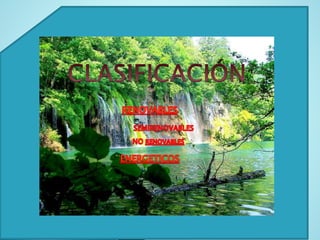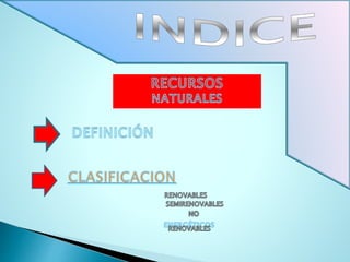 Los recursos naturales son materiales de la naturaleza que los seres humanos pueden usar para satisfacer sus necesidades. Se clasifican en renovables, semi-renovables y no renovables. Los renovables incluyen la vegetación, fauna, clima, agua y algunos recursos energéticos. Los semi-renovables son principalmente el suelo. Los no renovables como los minerales y combustibles fósiles no se regeneran y existen en cantidad fija.