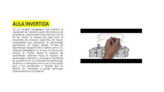 El documento describe el modelo pedagógico del aula invertida, el cual propone transferir parte del proceso de enseñanza y aprendizaje fuera del aula para utilizar el tiempo de clase en procesos cognitivos más complejos. Se definen cuatro pilares del aula invertida: entorno flexible, cultura de aprendizaje, contenido intencional y educador profesional. También se mencionan algunas ventajas como mejorar el ambiente de trabajo y desventajas como requerir más trabajo del docente.