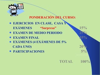 PONDERACIÓN DEL CURSO:EJERCICIOS EN CLASE, CASA Y EXÁMENES “Sorpresa” 15% EXAMEN DE MEDIO PERIODO 25% EXAMEN FINAL 35% EXÁMENES (4 EXÁMENES DE 5% CADA UNO) 20% PARTICIPACIONES 5% TOTAL 100%